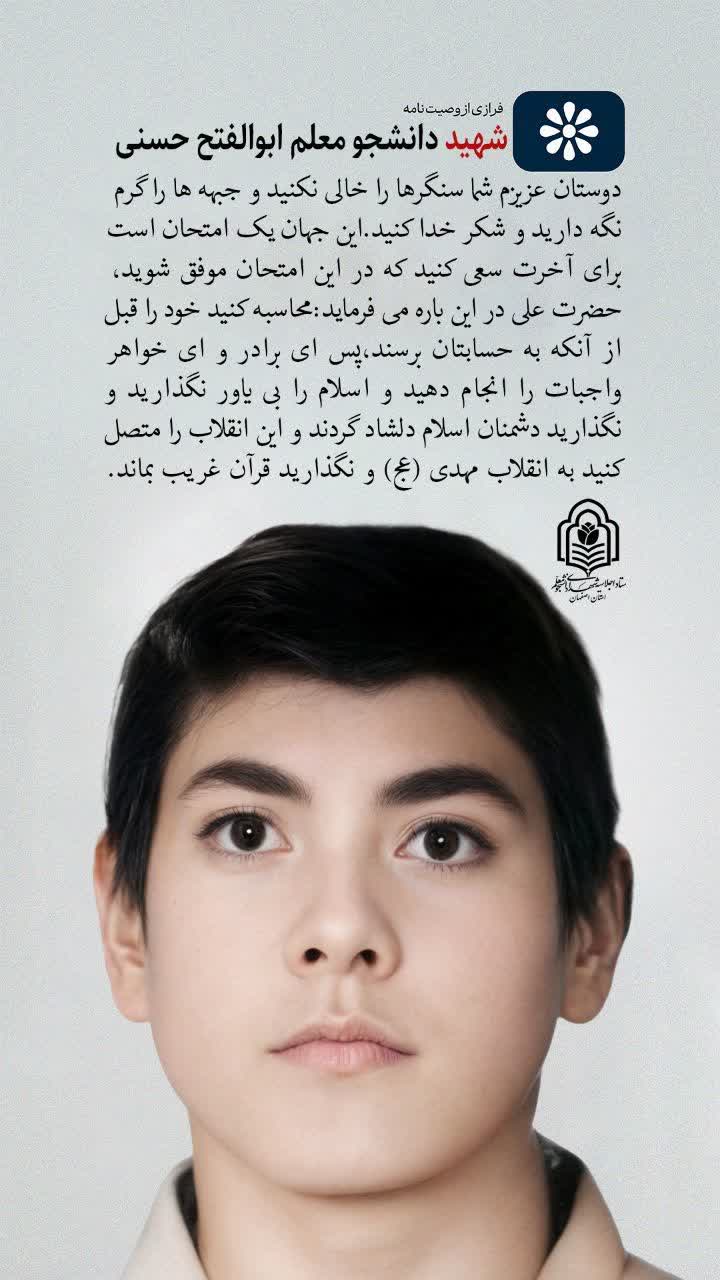 در آستانه ی نخستین اجلاسیه ی شهدای دانشجومعلّم استان اصفهان، یاد شهیدان عزیز را گرامی می داریم. این برنامه فرصتی است تا زندگی نامه و وصایای آنان را مرور کنیم و از راه و پیامشان برای آینده ی آموزش و پرورش الهام بگیریم.