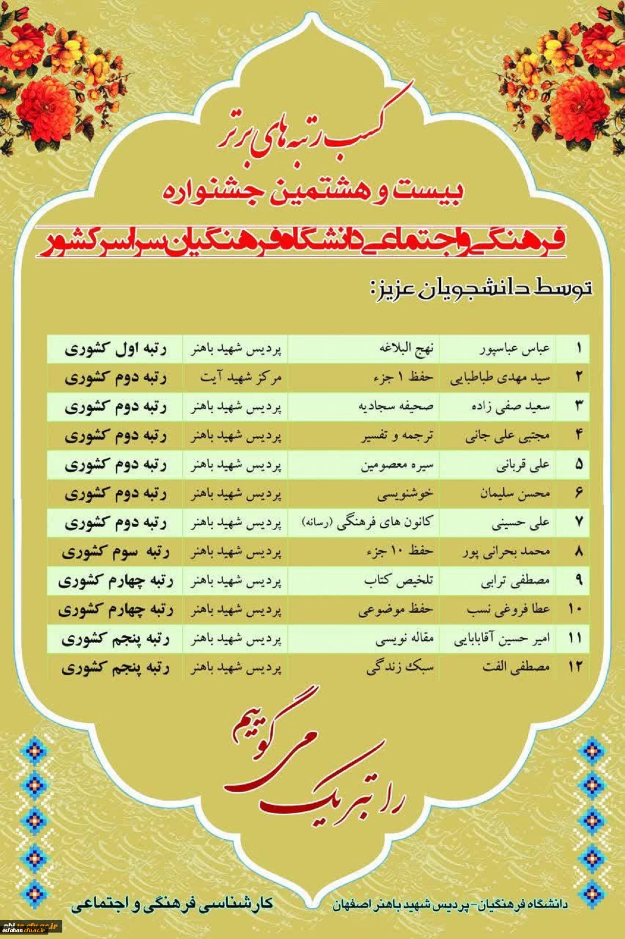 درخشش  دانشجویان پسراستان اصفهان در بیست وهشتمین جشنواره فرهنگی و اجتماعی