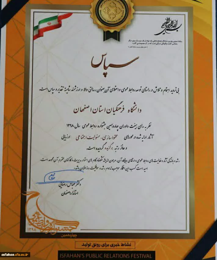روابط عمومی دانشگاه فرهنگیان استان اصفهان به عنوان روابط عمومی برگزیده استان اصفهان انتخاب گردید