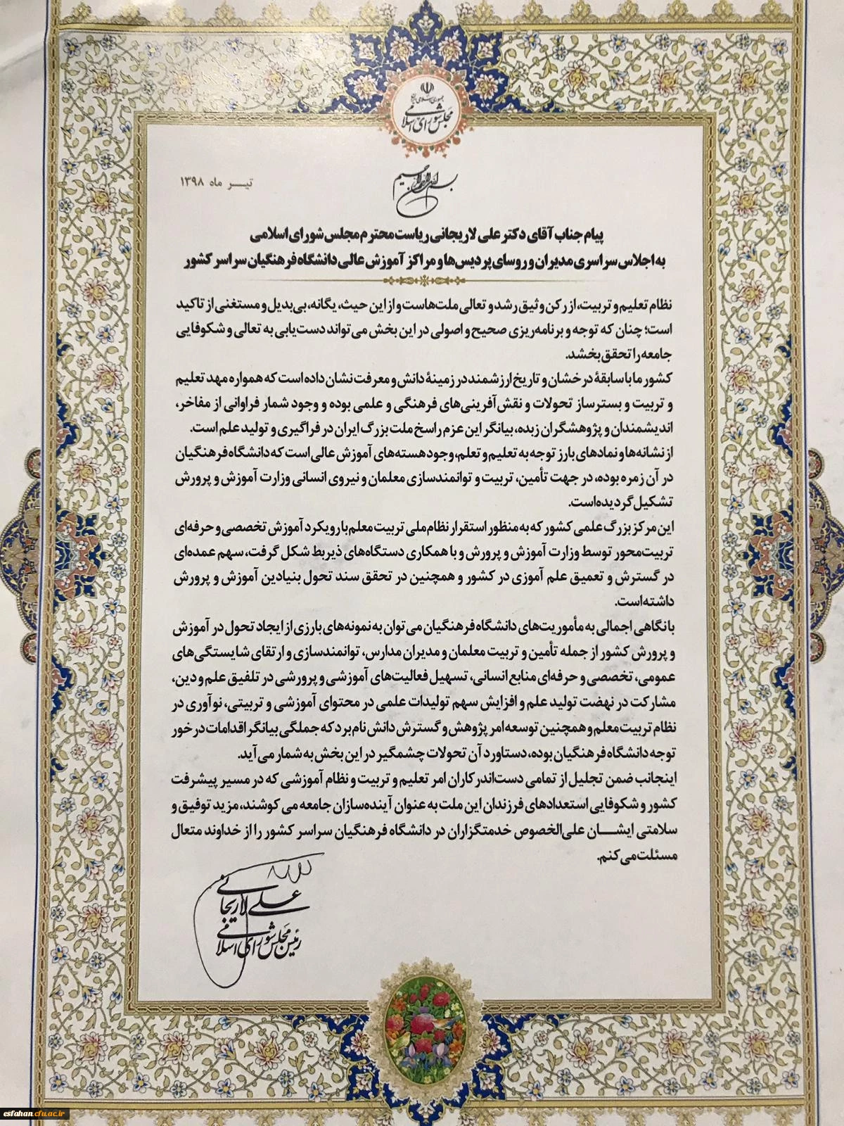 پیام رییس مجلس به اجلاس سراسری مدیران و روسای پردیس ها و مراکز دانشگاه فرهنگیان
