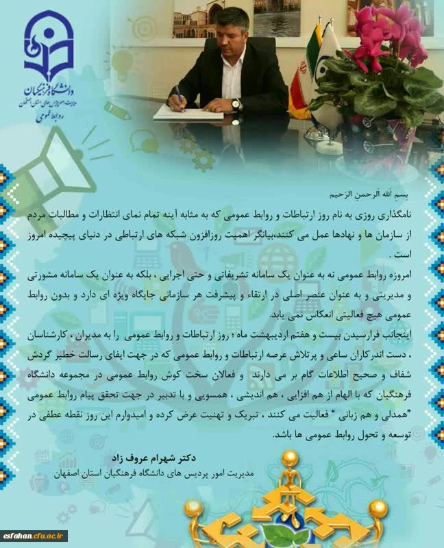 پیام تبریک رئیس دانشگاه فرهنگیان استان اصفهان به مناسبت روز ملی ارتباطات و روابط عمومی 3