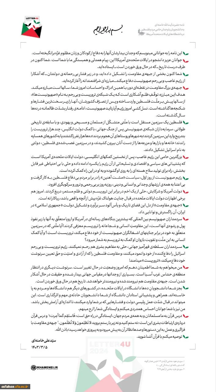 نامه حضرت آیت الله خامنه ای به دانشجویان حامی مردم فلسطین در دانشگاه های ایالات متحده آمریکا 3