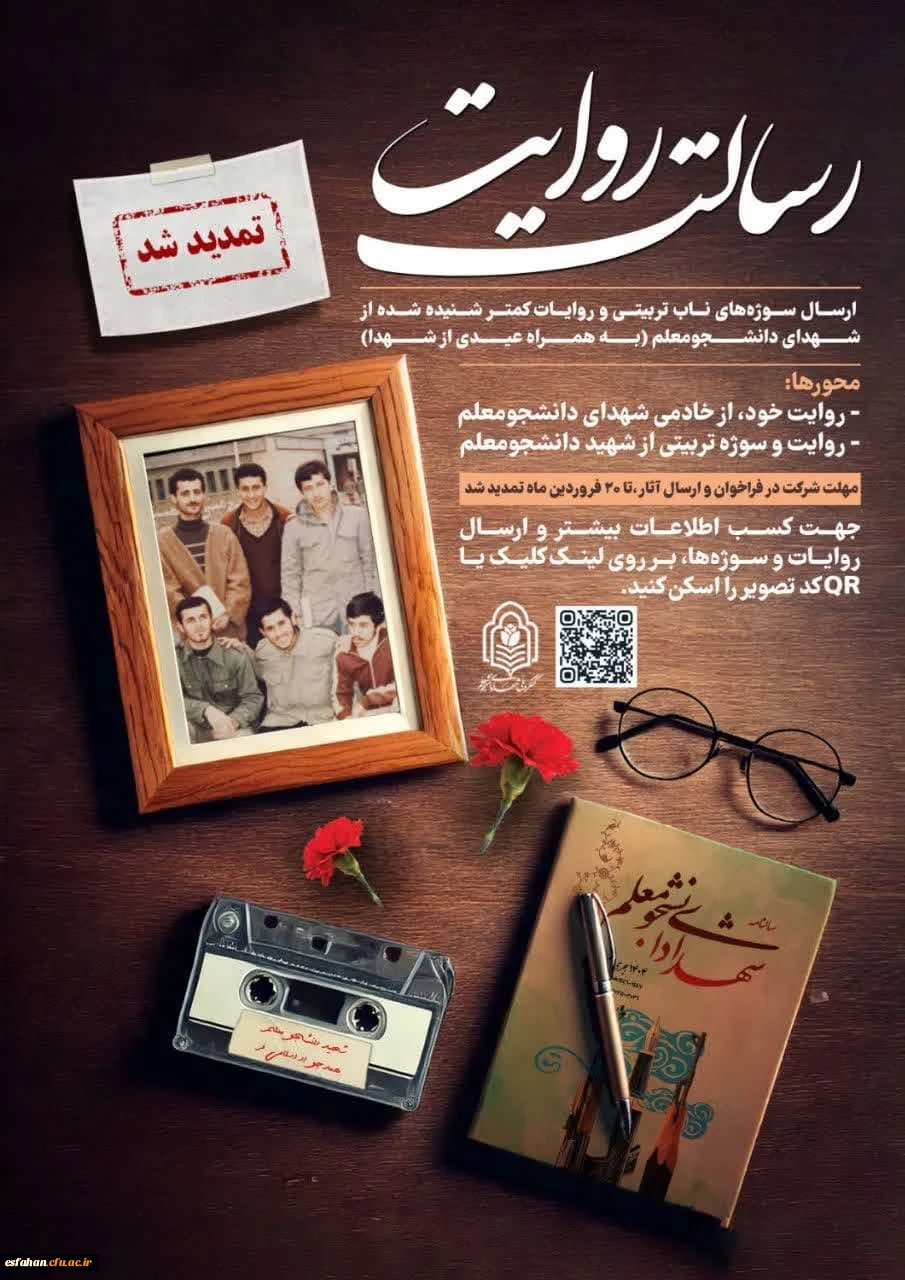 به دلیل استقبال قابل توجه مخاطبین از فراخوان رسالت روایت و درخواست مکرر خادمین شهدا، مهلت شرکت در این فراخوان تا ۲۰ فروردین ماه تمدید شد. 3