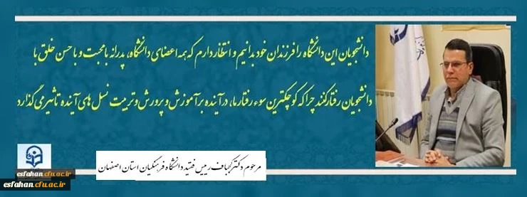 دانشجویان این دانشگاه را فرزندان خود بدانیم، و انتظار دارم که همه اعضای دانشگاه، پدرانه، با محبت و با حسن خلق با دانشجویان رفتار کنند چراکه کوچکترین سوءرفتار ما آینده بر آموزش و پرورش و تربیت نسل های آینده تاثیر می گذارد. 2