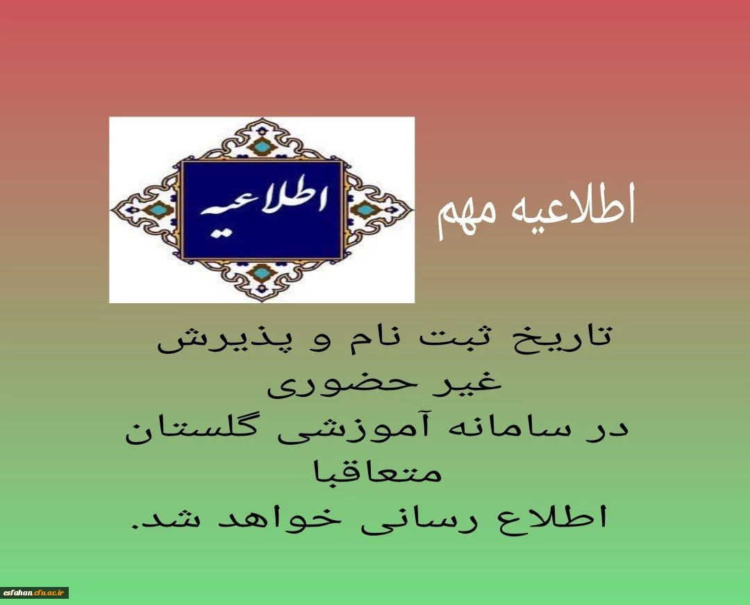 «تاریخ ثبت نام و پذیرش غیر حضوری در سامانه آموزشی گلستان» متعاقبا اطلاع رسانی خواهد شد. 2