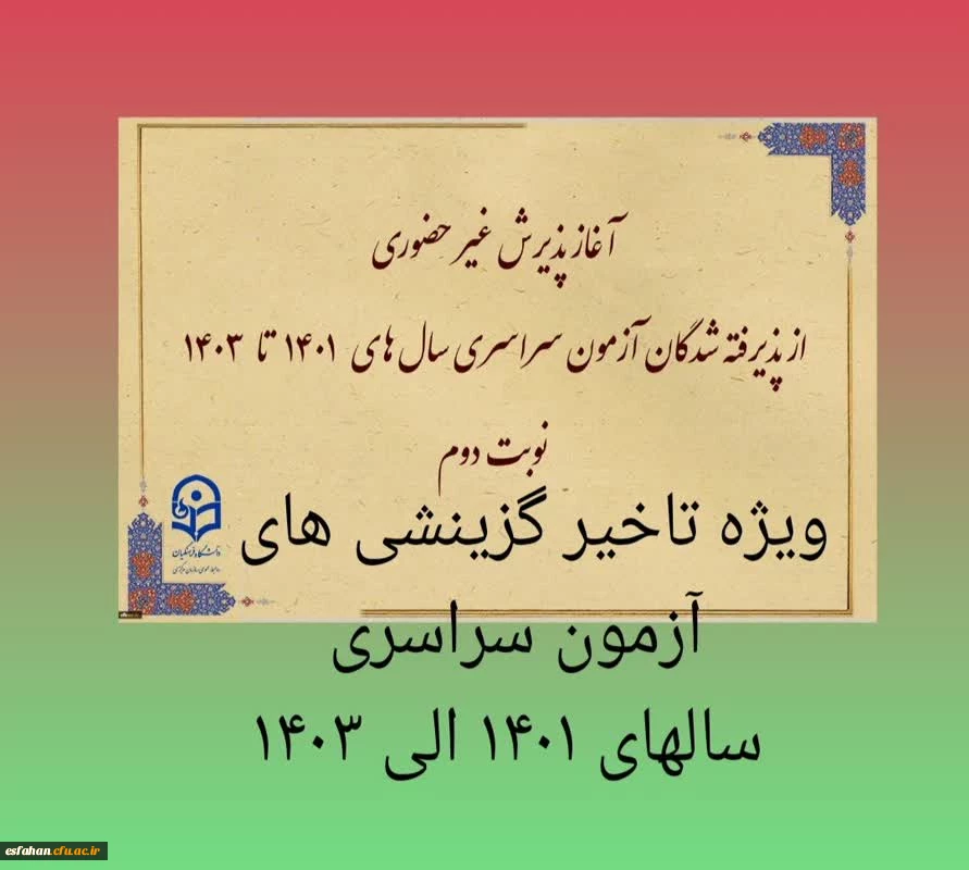 آغاز پذیرش غیر حضوری از پذیرفته شدگان تاخیر گزینش آزمون سراسری سال های 1401 الی 1403 در مقاطع کاردانی و کارشناسی پیوسته 2
